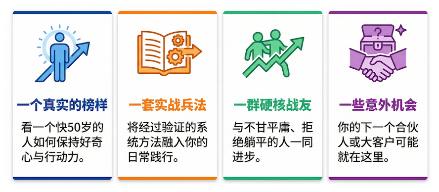 一个真实的榜样(虽然我不完美): 我会每天在群里分享我的践行:我的播客(可能是一睁眼录的,带着起床气)、我的运动(刚游完2000米的狼狈样)、我的思考(对国际局势的喷,对商业的观察)。 我会让你看到,一个快50岁的人,是如何保持好奇心,如何折腾,如何活出“一人公司”的状态的。